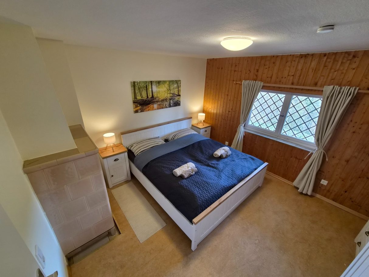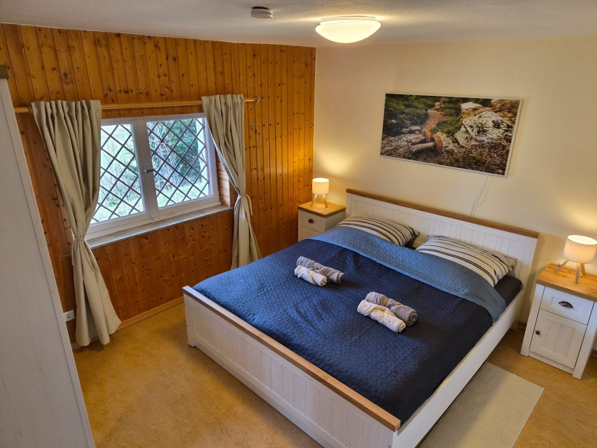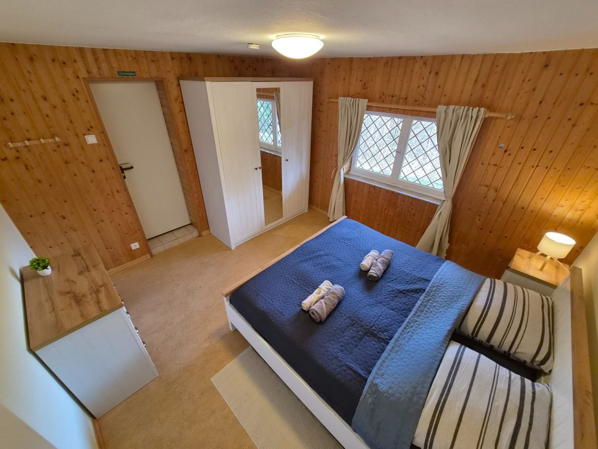 Dieses Schlafzimmer befindet sich im Untergeschoss und ist das wärmste Schlafzimmer im Haus, da es direkt neben dem Brenner der Heizung liegt. Es eignet sich ideal für Gäste, die es beim Schlafen gerne etwas wärmer haben.