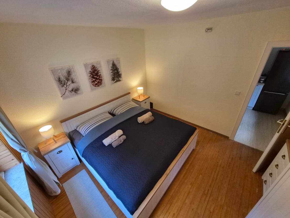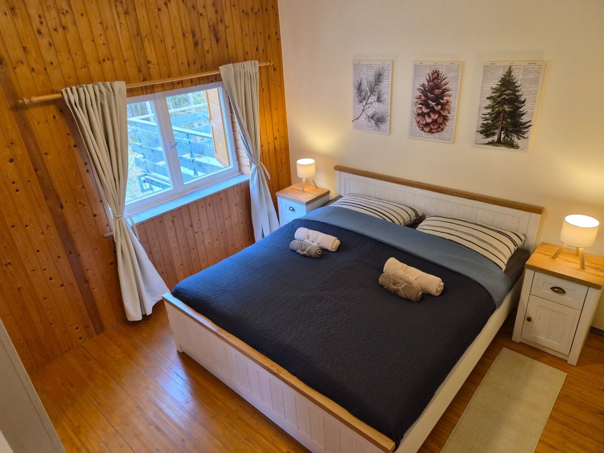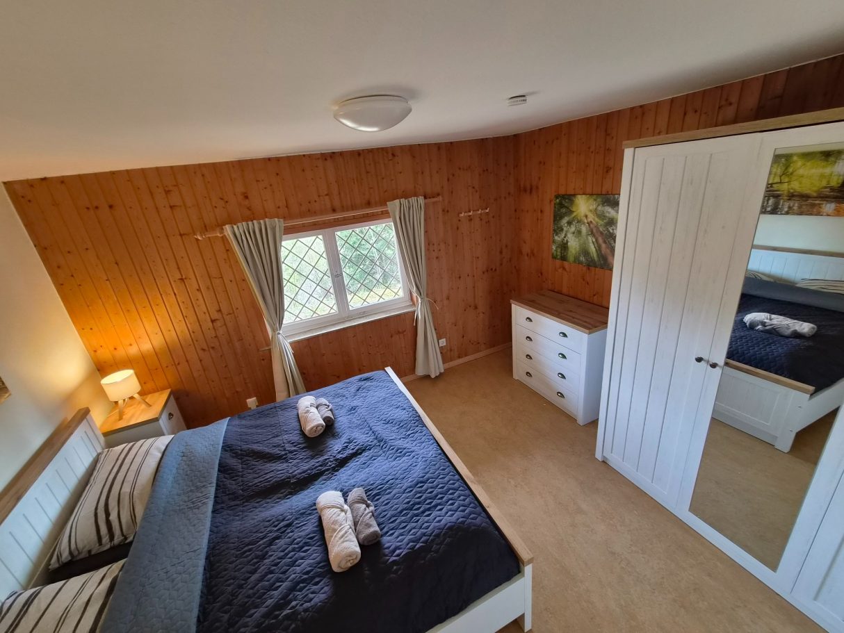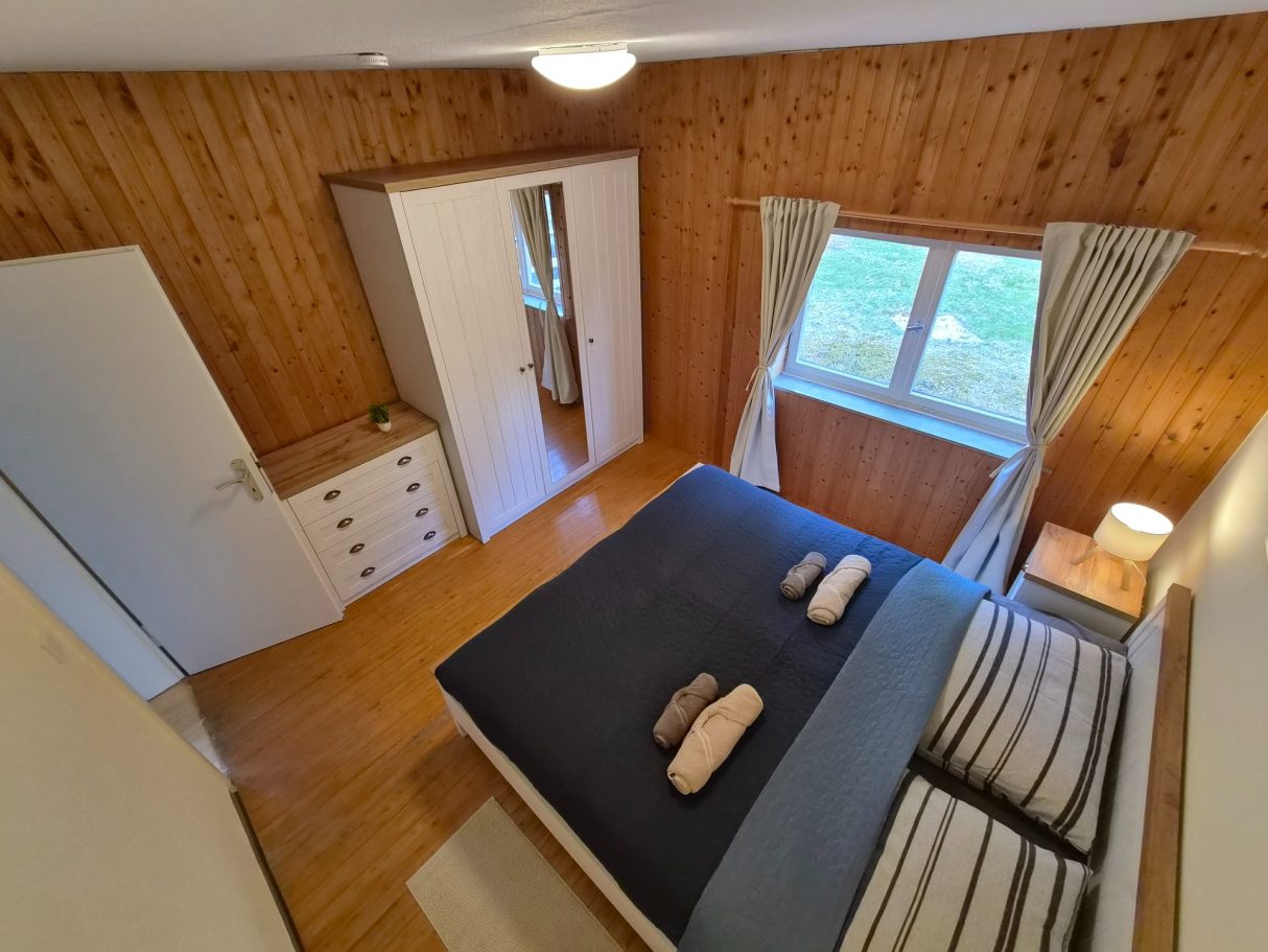 Dieses Schlafzimmer befindet sich im Untergeschoss und ist das wärmste Schlafzimmer im Haus, da es direkt neben dem Brenner der Heizung liegt. Es eignet sich ideal für Gäste, die es beim Schlafen gerne etwas wärmer haben.
