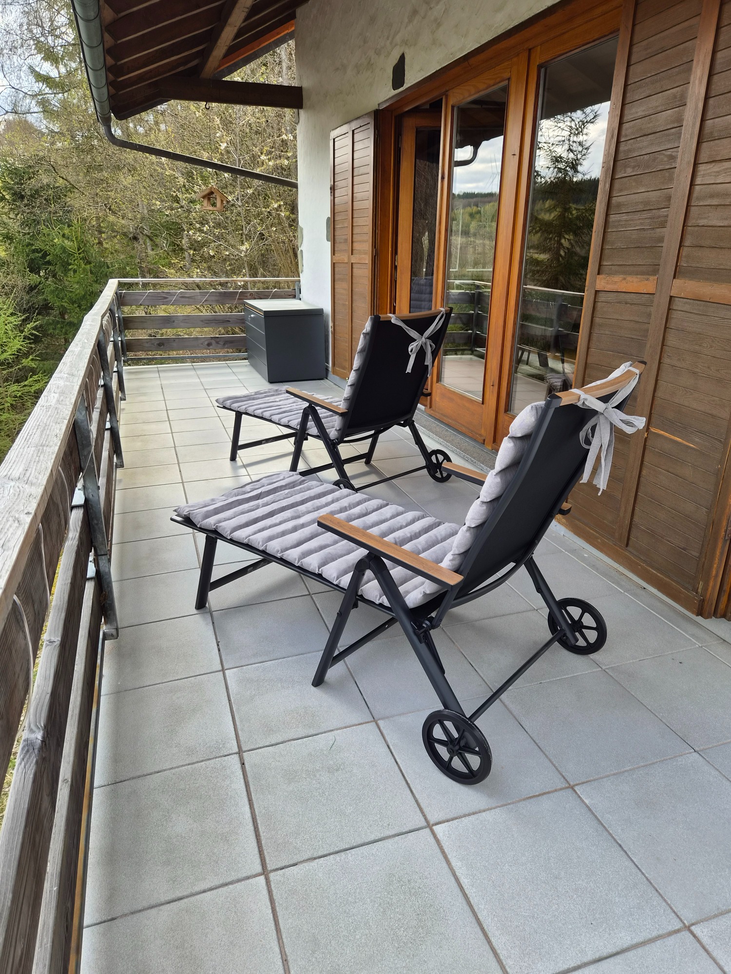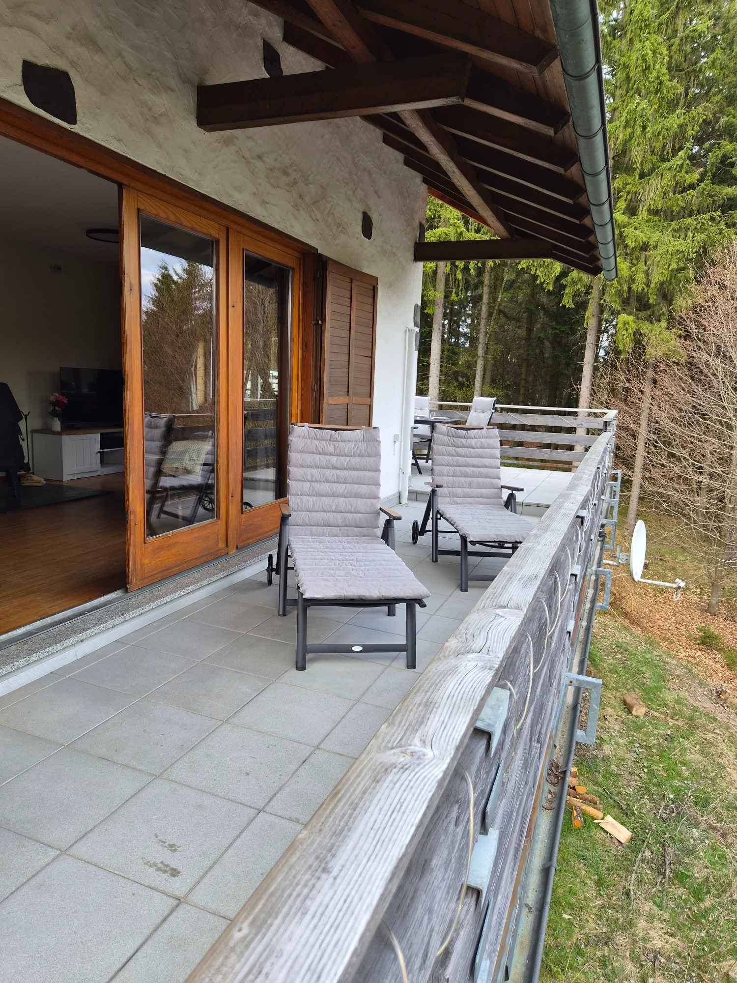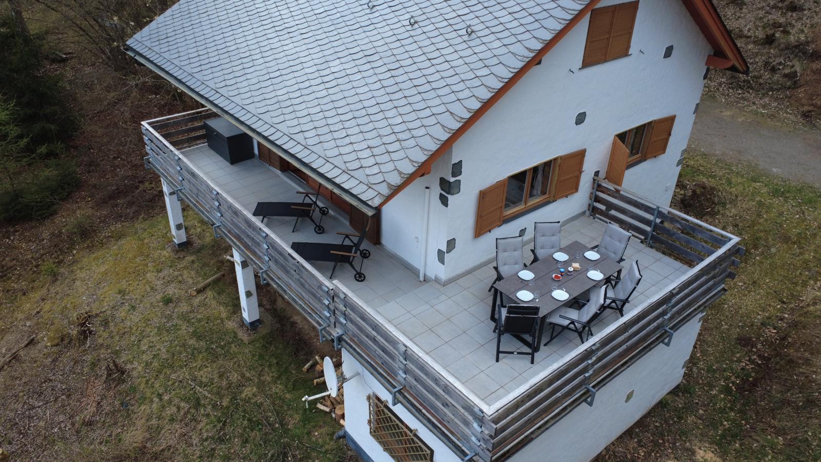 Der umlaufende Balkon mit 40 m² lädt zum Entspannen und Genießen ein. Ein großer Esstisch für bis zu sechs Personen sowie zwei Sonnenliegen bieten viel Komfort im Außenbereich.