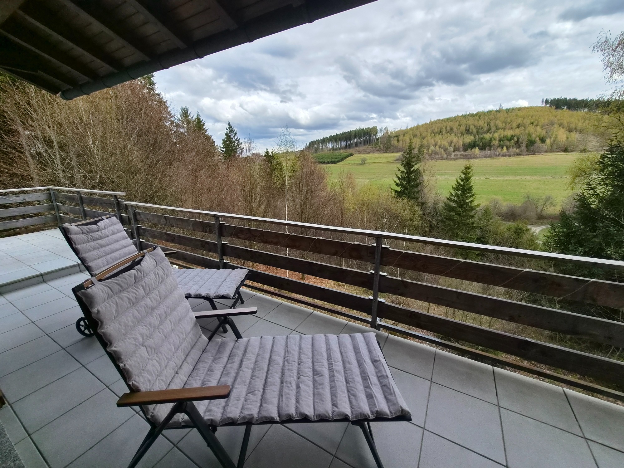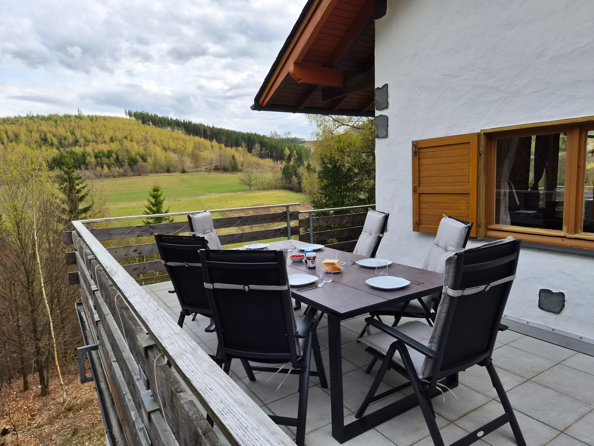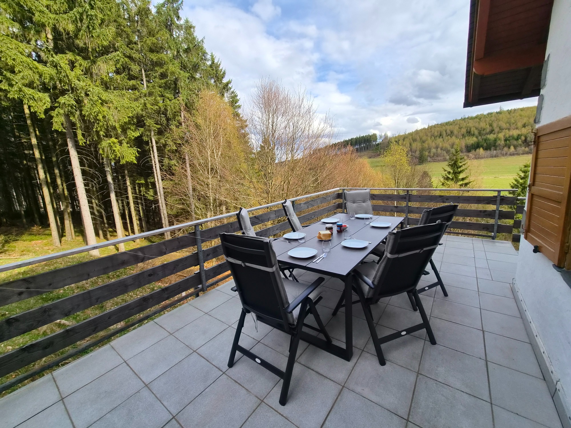 Der umlaufende Balkon mit 40 m² lädt zum Entspannen und Genießen ein. Ein großer Esstisch für bis zu sechs Personen sowie zwei Sonnenliegen bieten viel Komfort im Außenbereich.