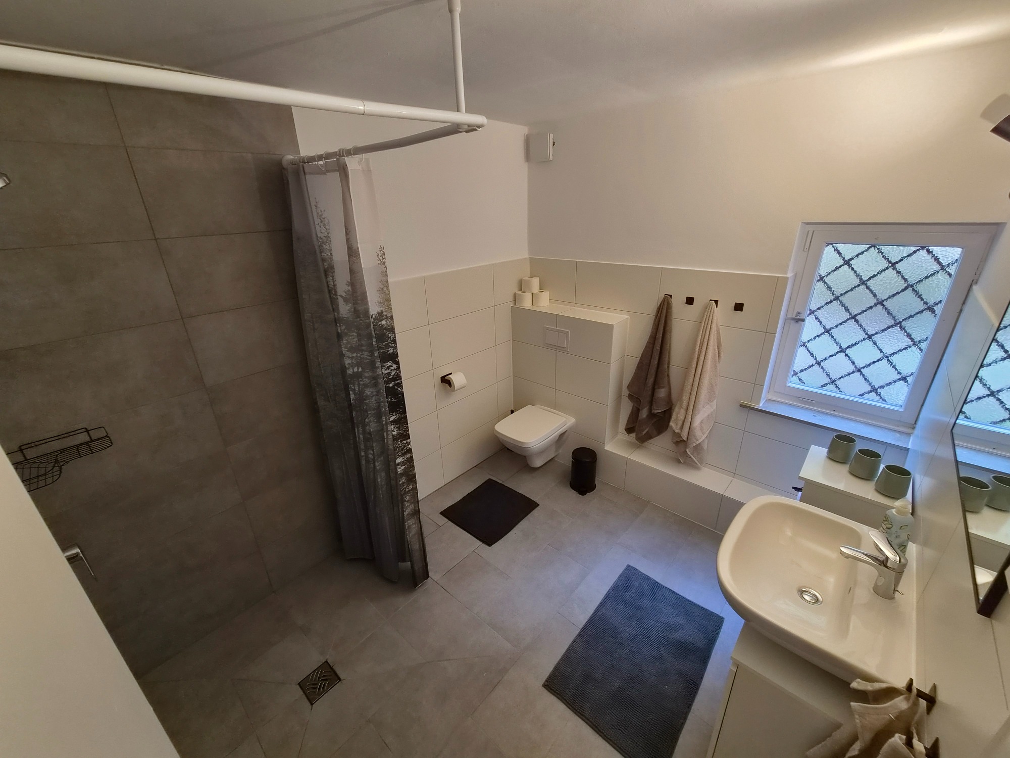 Die Dusche ist mit einem Duschvorhang ausgestattet, der bei Nichtbenutzung für ein besonders großzügiges Raumgefühl sorgt und das Bad offen und freundlich wirken lässt. Zudem steht Ihnen ein Föhn zur Verfügung.