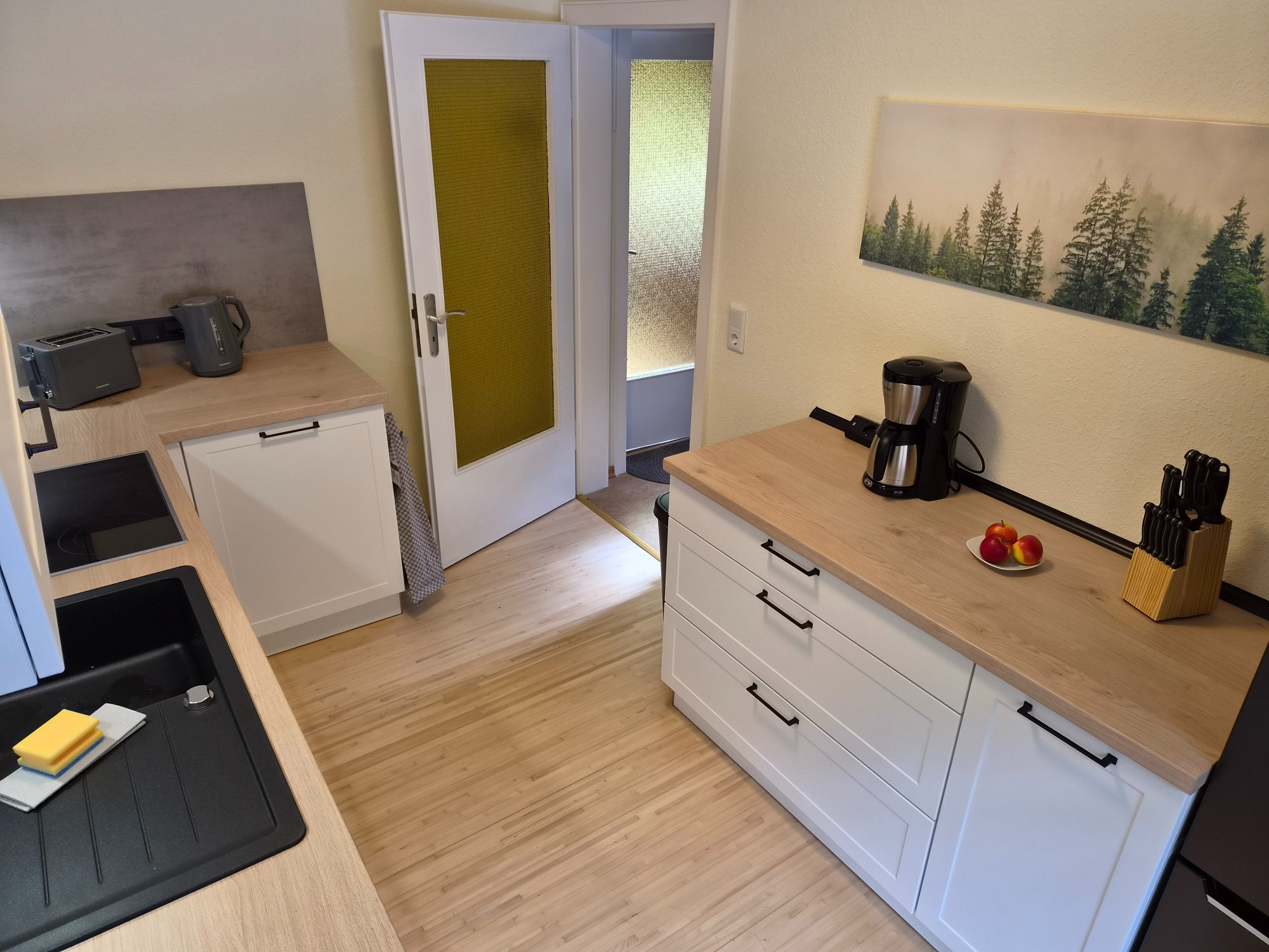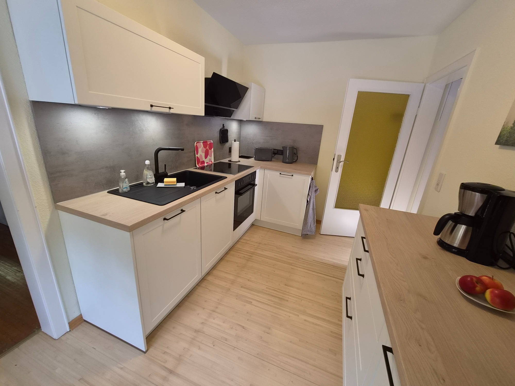 Unsere Küche ist vollständig und modern ausgestattet und bietet alles, was Sie für Ihren Aufenthalt benötigen. Sie verfügt über einen Toaster, Wasserkocher, Eierkocher sowie eine Kaffeemaschine. Eine umfangreiche Küchenausstattung mit allen wichtigen Utensilien ermöglicht Ihnen die bequeme Zubereitung Ihrer Mahlzeiten.