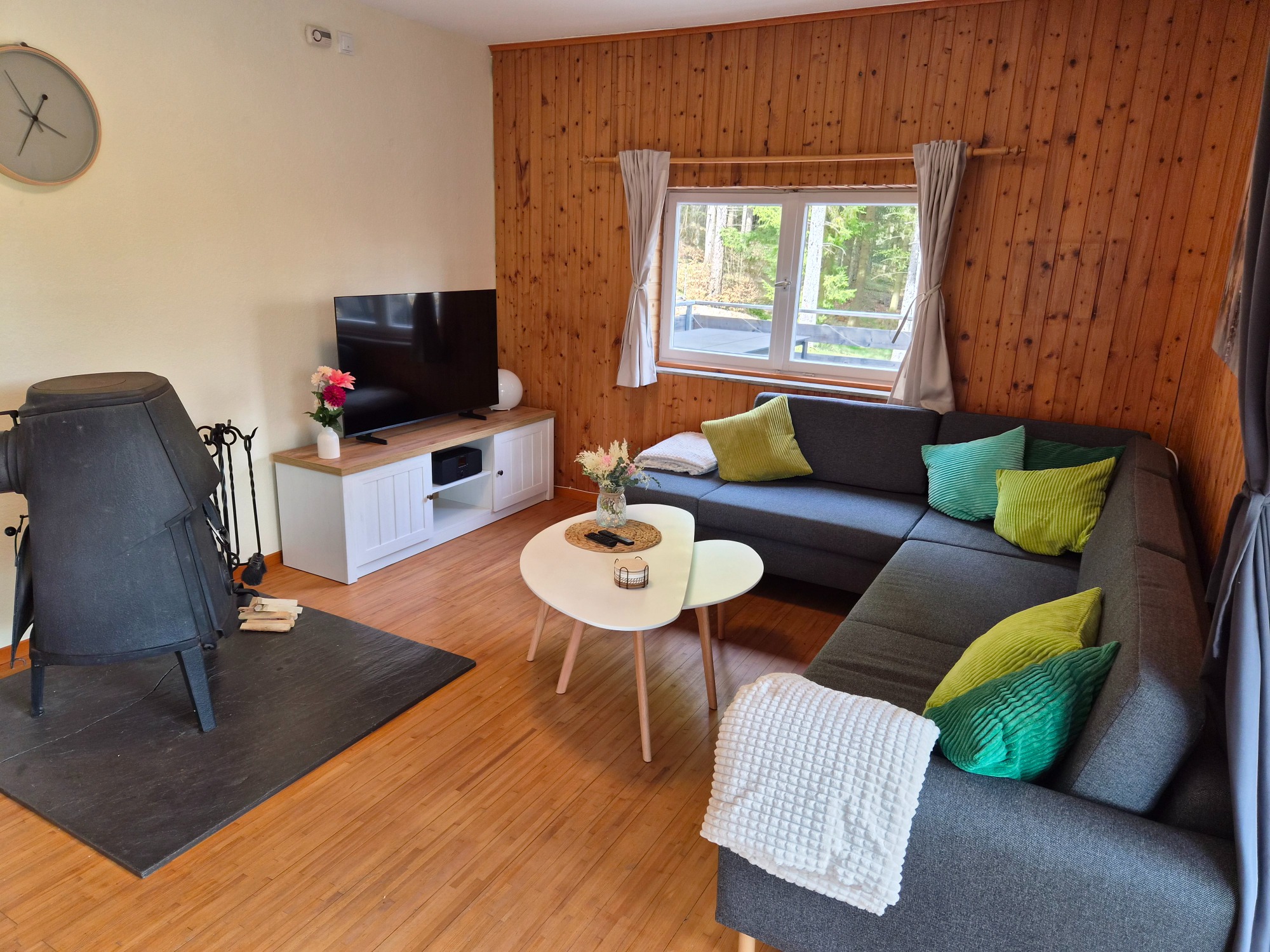 Der Wohn- und Essbereich lädt zu gemütlichen und geselligen Stunden ein. Im Wohnbereich sorgt eine bequeme Couch in Kombination mit Smart TV, Radio und Kamin für eine besonders behagliche Atmosphäre – ideal für entspannte Abende.